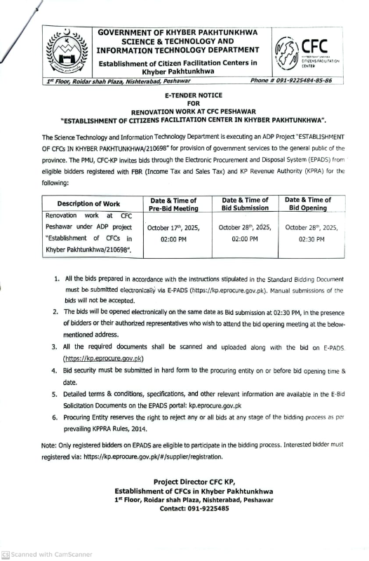E-TENDER FOR ESTABLISHMENT OF CITIZEN FACILITATION CENTER IN KHYBER PAKHTUNKHWA RENOVATION WORK IN CFC PESHAWAR |